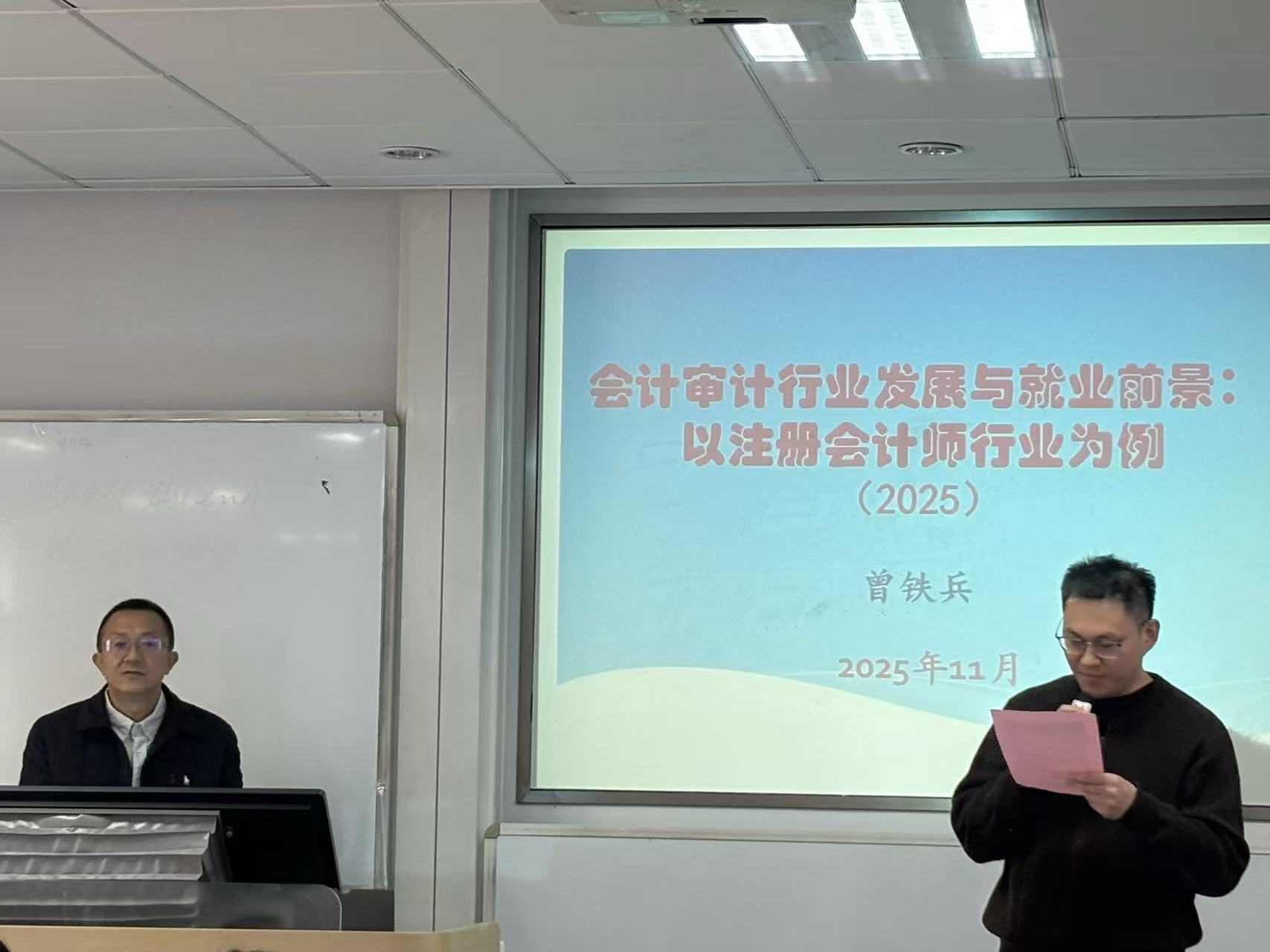 2025年11月26日,伟德国际1946源于英国邀请曾铁兵主编作了一场高水平的学术交流活动。会议伊始,伟德国际1946源于英国MPAcc办公室主任张金泉博士对曾铁兵的学术背景和主要成就作了简要介绍,随后邀请曾铁兵围绕行业现状、研究方向及职业机遇展开深度解读,为会计专业从业者与研究者厘清了行业脉络。